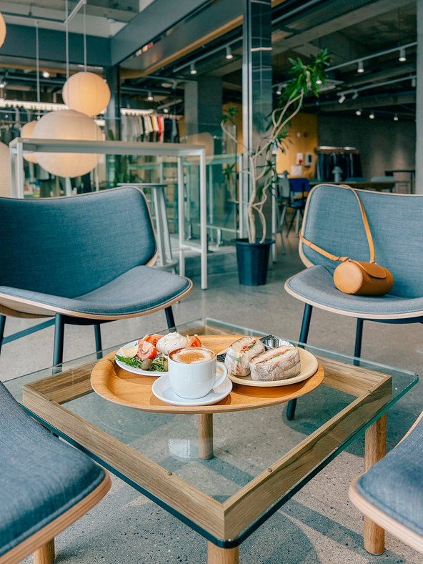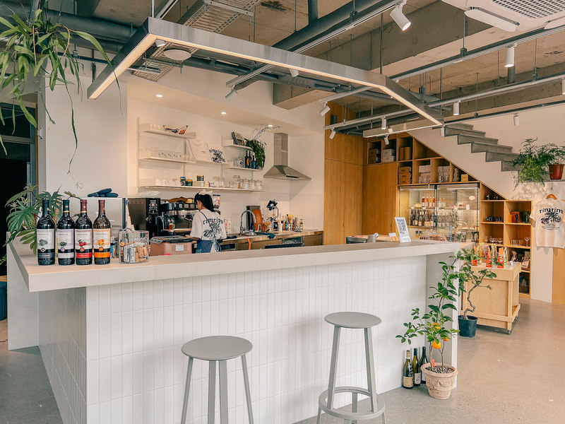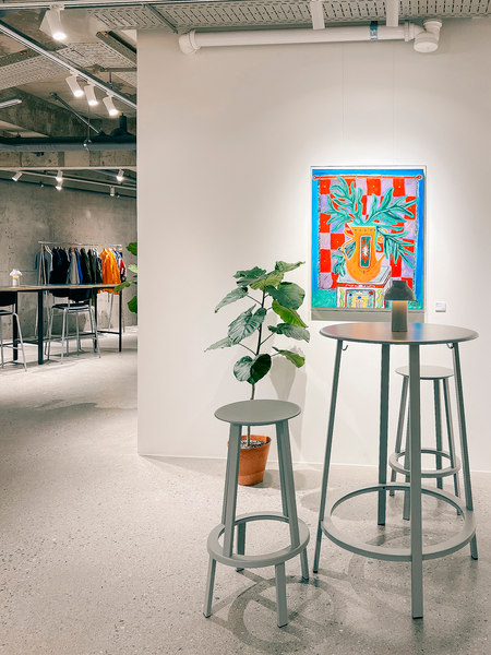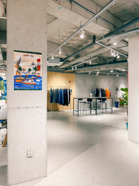 Двухэтажное пространство, поделенное на зоны – стойка приема заказов, кафе со столиками, выставочные площади и продажа качественных сувениров с символикой Пусана – сумок, футболок, посуды и другого.